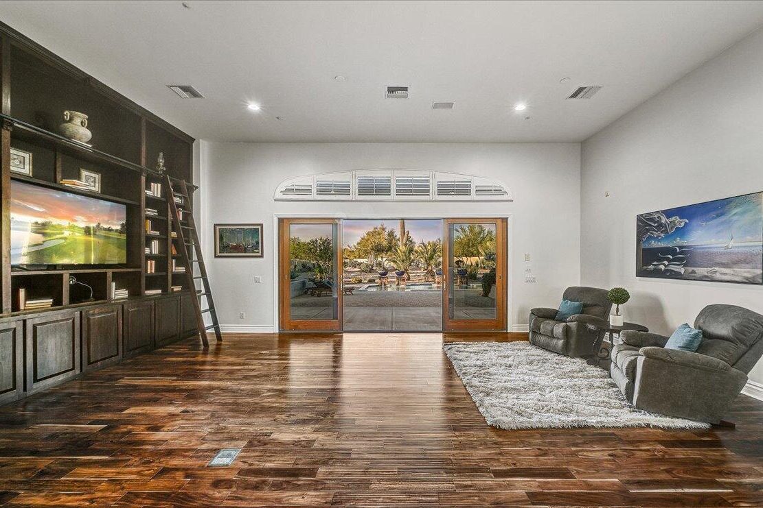 Step outside and experience a private botanical oasis. The property is adorned with a variety of mature trees and desert flora, including Joshua trees, citrus, pineapple palms, towering saguaros, and sculptural agaves. Four serene waterfalls create a spa-like ambiance, while the sparkling pool and expansive covered patio provide the ultimate setting for entertaining or unwinding in solitude. Nearly three-quarters of an acre of the yard is block-fenced—ideal for pets, gatherings, or future enhancements.